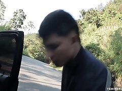 Cute middle doing blowjob handjob her boyfriend dick outdoor