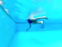 Aliha Aldamen tans her fair skin outside by the pool while wearing a blue and white striped bikini before masturbating on the deck.
