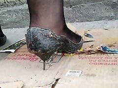 Girl stomping on picture in black metal high heels