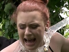 Brunette mouth held open while bound to table